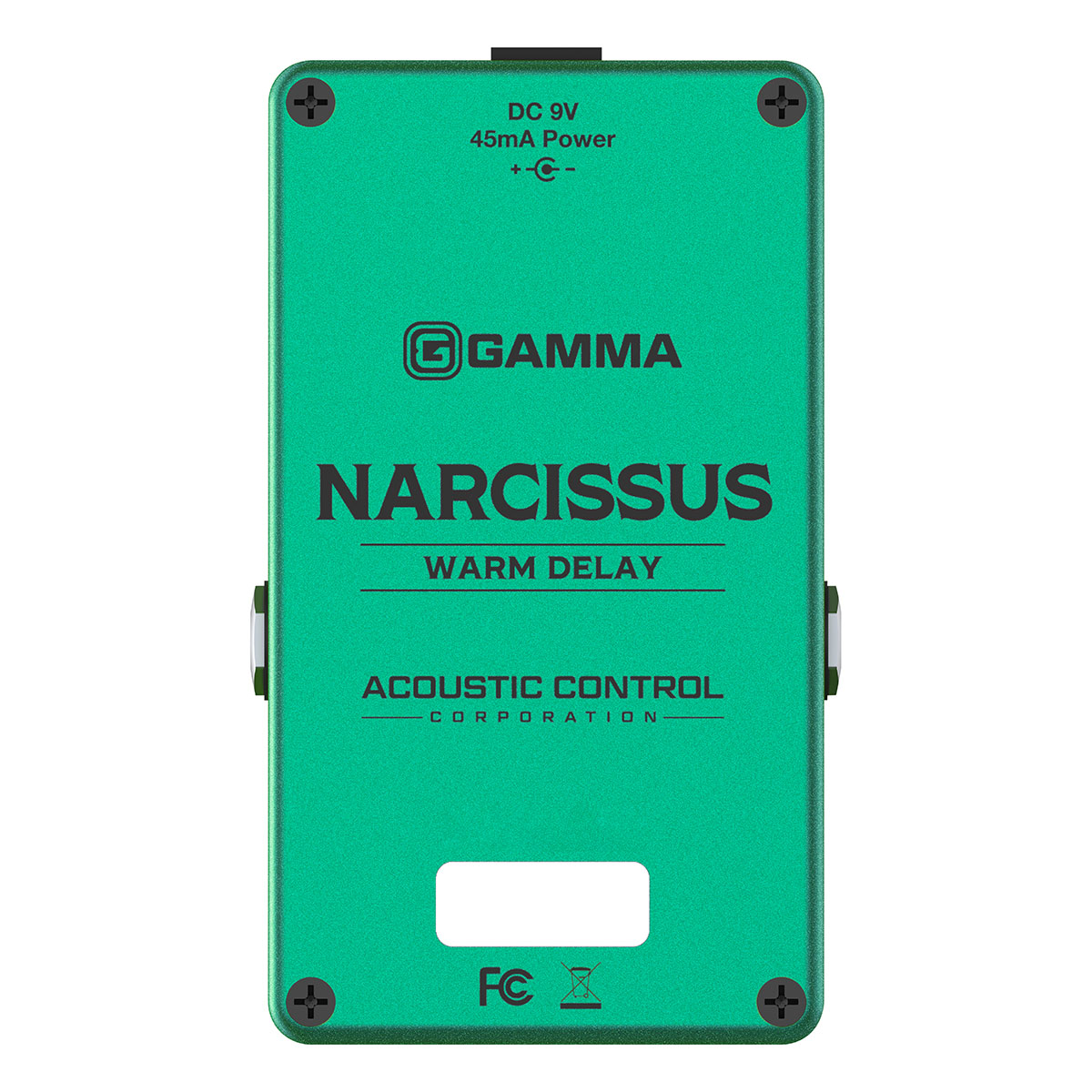 The NARCISSUS Warm Delay pedal features a metal case and metal knobs for maximum durability. The battery compartment is easily accessed from the bottom panel, and the NARCISSUS Warm Delay can also be powered by a standard 9V pedal power supply (not included).